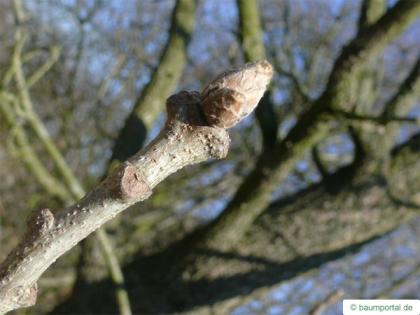 The branches are first olive green and smooth, later brownish with lenticels. The buds are brown, ovoid thick and pointed.