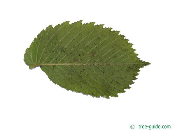 The leaves of European white elm are ovate, have an asymmetrical leaf base and are up to 7 cm (2.8 in) long and up to 7 cm (2.8 in) broad. The petiole is short. The leaf margin is double serrated.
