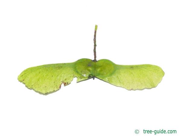 The fruit is a samara with two winged nutlets. The wings are to each other horizontally.